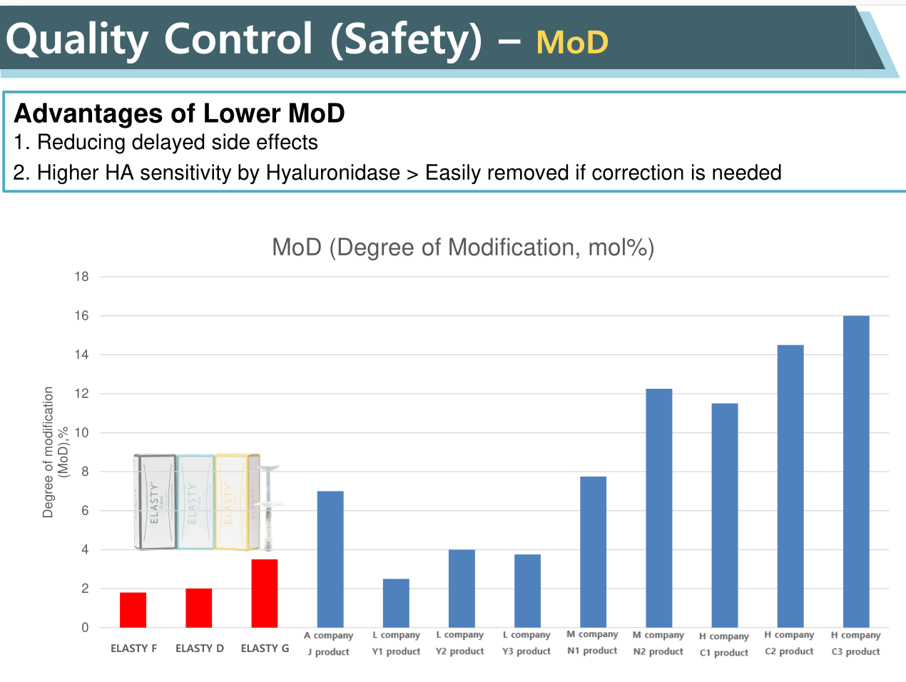 - High Safety Profile (Low MoD): Elasty demonstrates a very low Degree of Modification (MoD), which reflects how much the HA has been chemically altered.