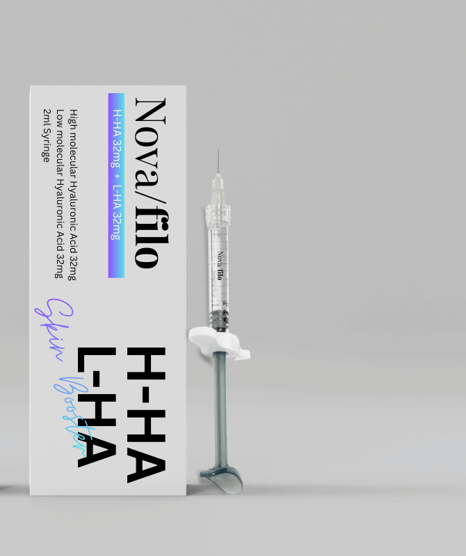 Nova/filo is an innovative skin booster containing 32mg of high molecular weight hyaluronic acid, and 32mg of low molecular weight of hyaluronic acid.
